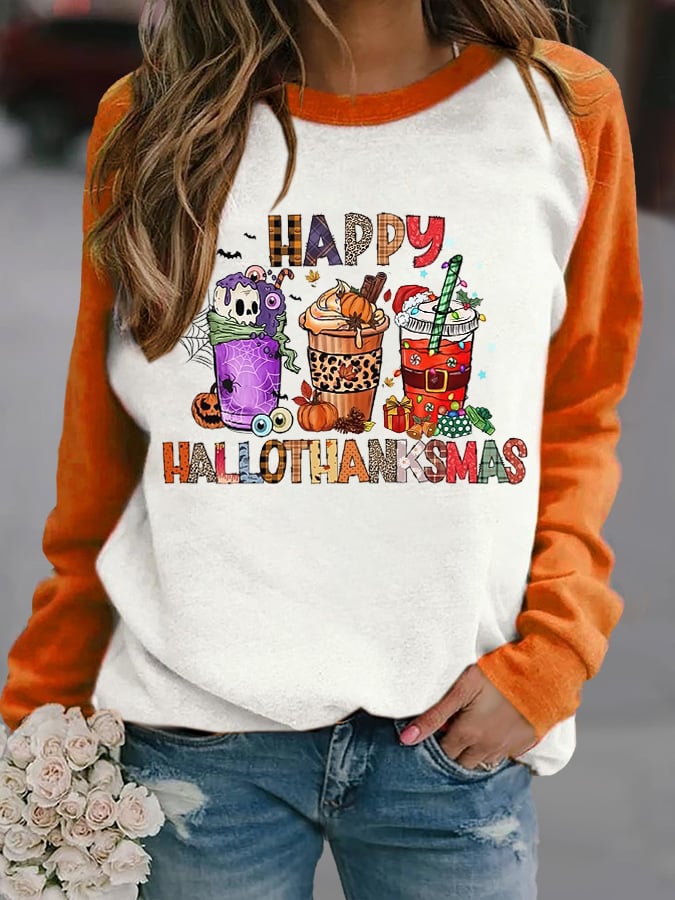 Happy Hallothanksmas Pumpkin Drink Skull Print Sweatshirt