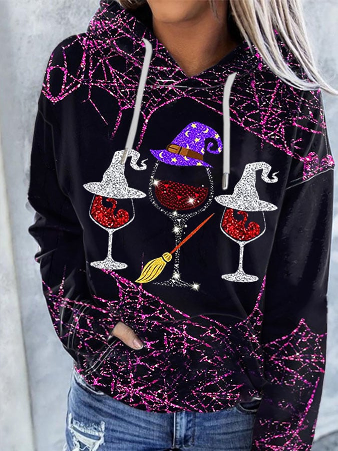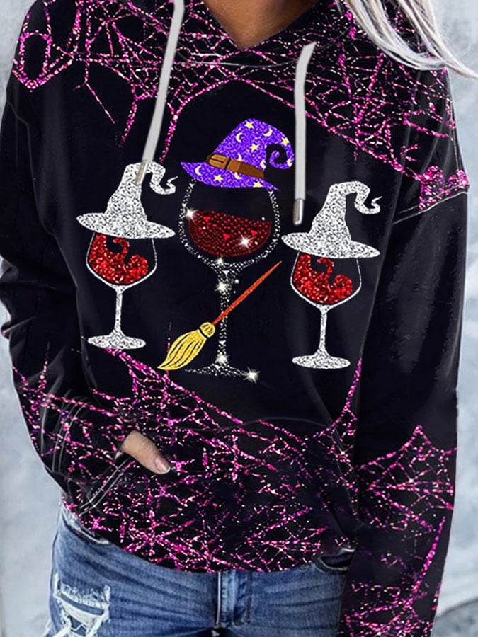 Women'S Casual Halloween Wine Glass Printed Hooded Long-Sleeve Sweatshirt