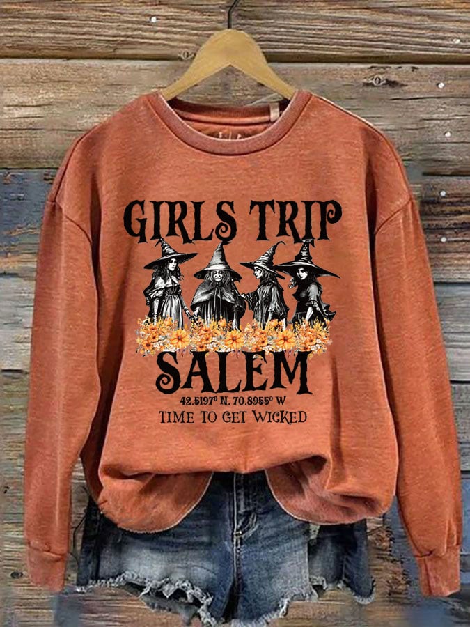 Women's Girl's Trip Salem Time To Get Wicked Halloween Print Crew Neck Sweatshirt