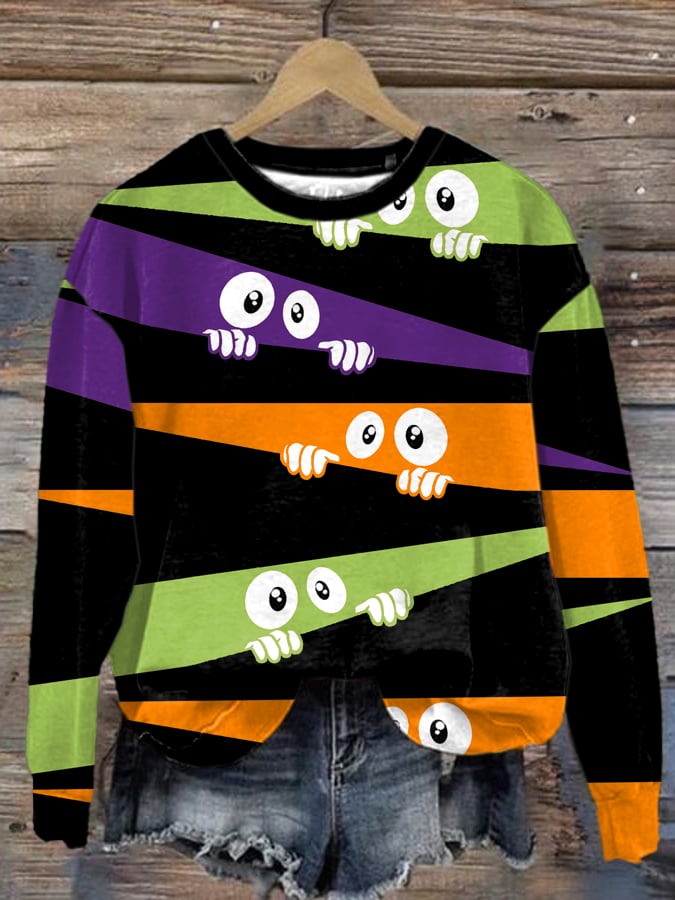 Women's Halloween Peek Monster Print Round Neck Sweatshirt