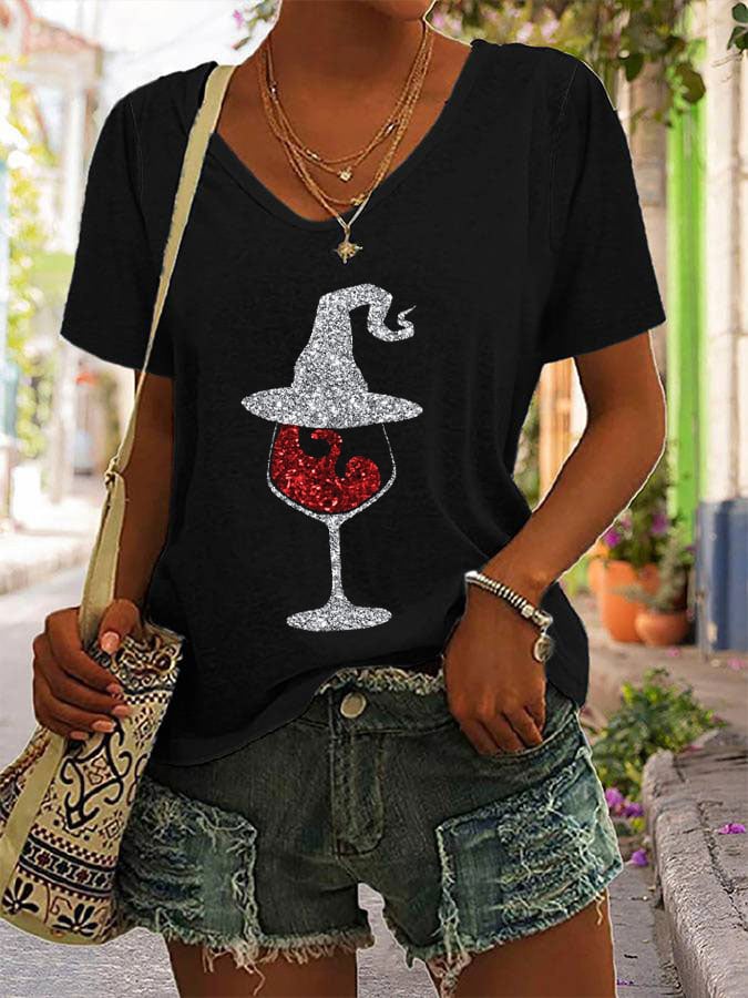 Women's Halloween Red Wine Glass Print Casual T-Shirt