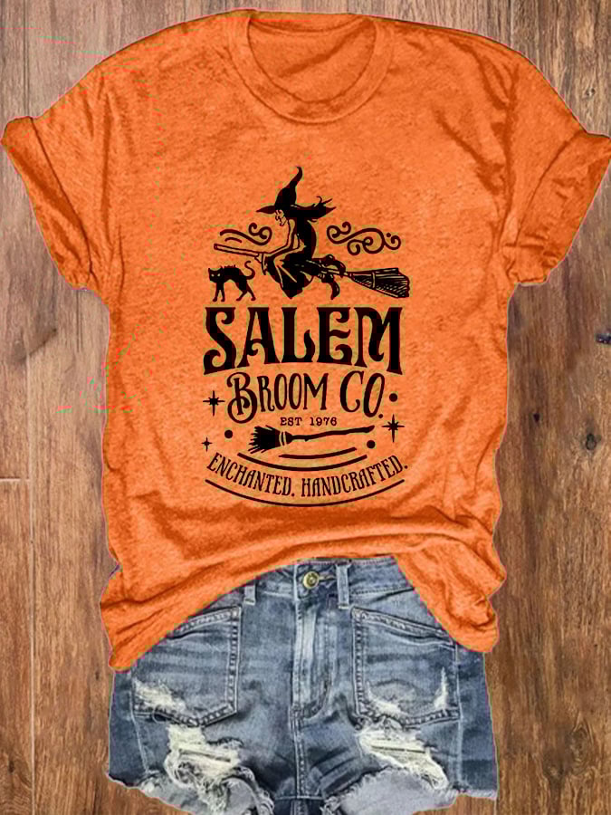 Women's Halloween Salem Broom Company Print O-Neck T-Shirt