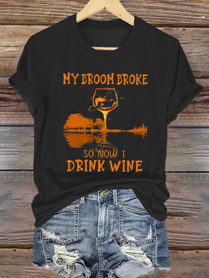 Women's My Broom Broke So Now I Drink Wine Print Casual T-Shirt