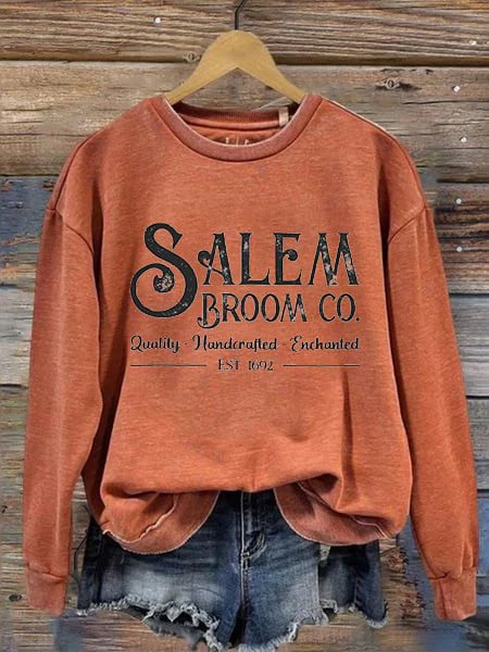 Women's Salem Broom Co Quality Handcrafted Enchanted Est 1692 Printed Round Neck Long Sleeve Sweatshirt