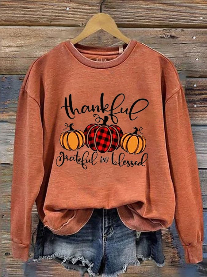 Women's Thanksgiving Thankful Grateful Blessed Printed Round Neck Long Sleeve Sweatshirt